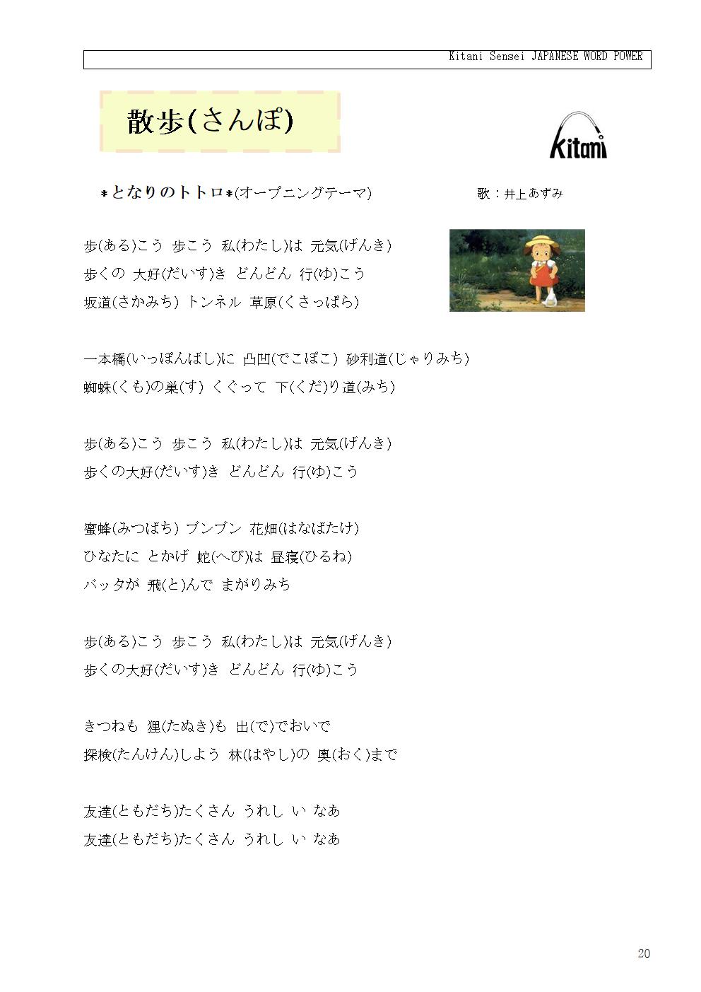 步(ある)こう 步こう 私(わたし)は 元気(げんき) 步くの 大好(だいす)き どんどん 行(ゆ)こう 坂道(さかみち) トンネル 草原(くさっぱら) 一本橋(いっぽんばし)に 凸凹(でこぼこ) 砂利道(じゃりみち) 蜘蛛(くも)の巢(す) くぐって 下(くだ)り道(みち) 步(ある)こう 步こう 私(わたし)は 元気(げんき) 步くの大好(だいす)き どんどん 行(ゆ)こう 蜜蜂(みつばち) ブンブン 花畑(はなばたけ) ひなたに とかげ 蛇(へび)は 昼寝(ひるね) バッタが 飛(と)んで まがりみち 步(ある)こう 步こう 私(わたし)は 元気(げんき) 步くの大好(だいす)き どんどん 行(ゆ)こう きつねも 狸(たぬき)も 出(で)でおいで 探検(たんけん)しよう 林(はやし)の 奧(おく)まで 友達(ともだち)たくさん うれし い なあ 友達(ともだち)たくさん うれし ..