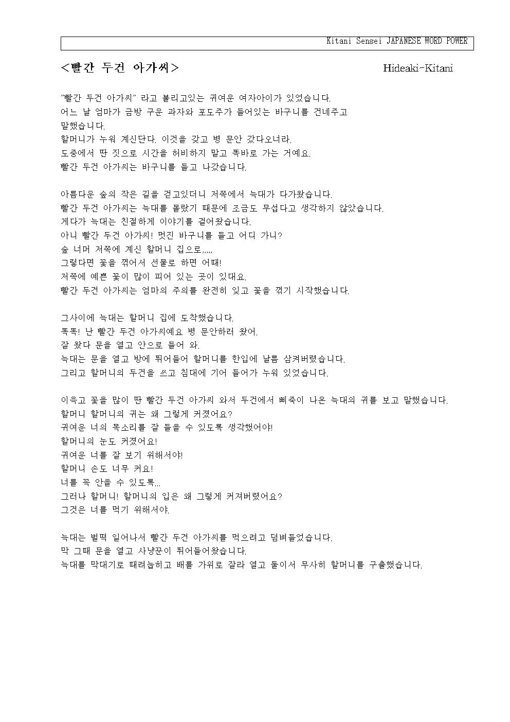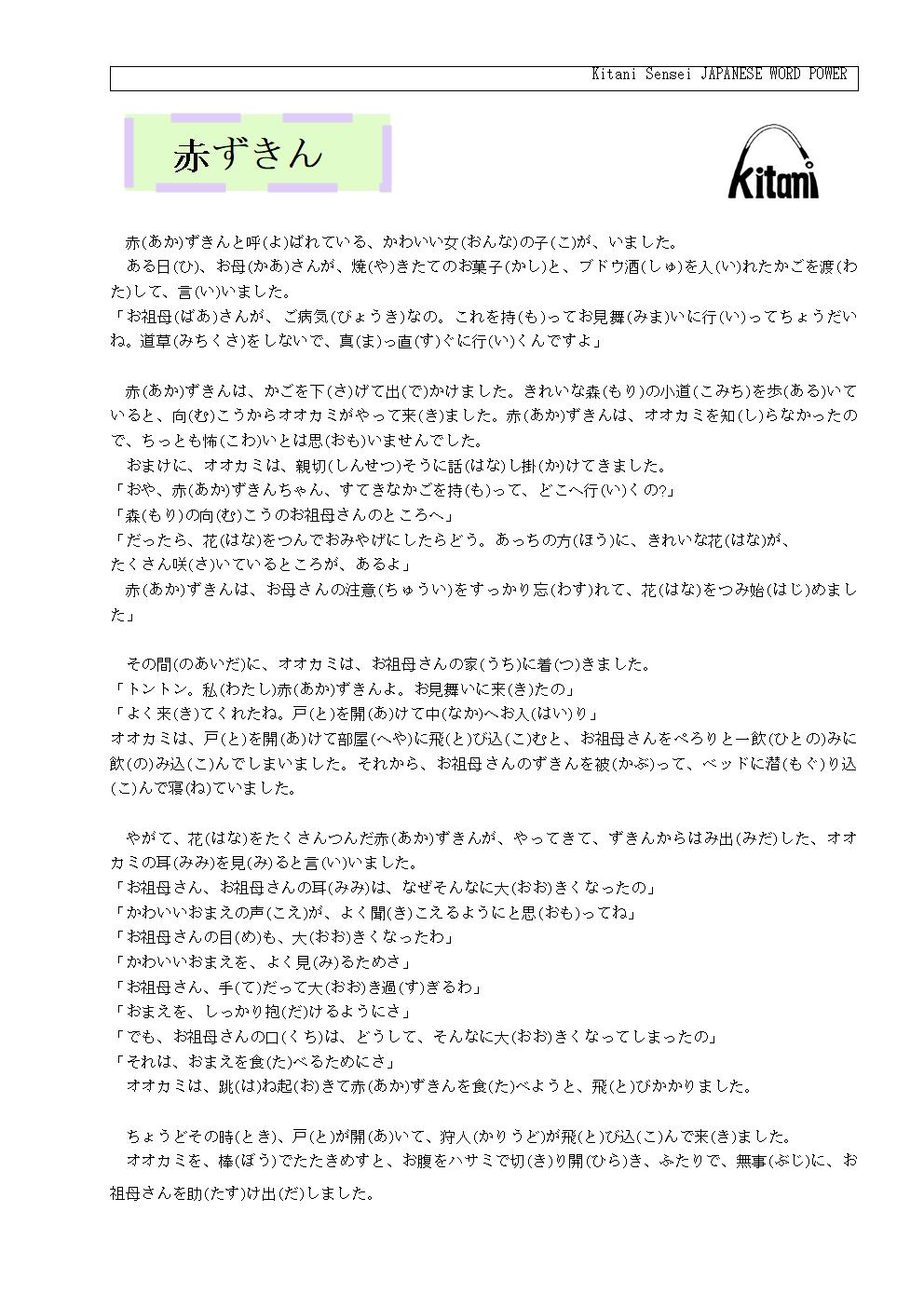 赤(あか)ずきんは、かごを下(さ)げて出(で)かけました。きれいな森(もり)の小道(こみち)を步(ある)いていると、向(む)こうからオオカミがやって来(き)ました。赤(あか)ずきんは、オオカミを知(し)らなかったので、ちっとも怖(こわ)いとは思(おも)いませんでした。