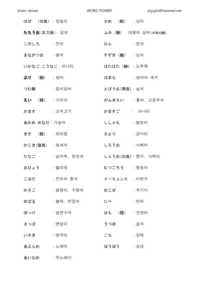 Word power 日本と韓国の魚の名前 utyujin 2024. 2. 1. 21:21 728x90 この単語集は、翻訳の保証をするものではありません。特に魚類の名称は、地方によって、また辞書によって異なる部分が多くあります。実際に現地の人も間違って使用している人が多くいます。